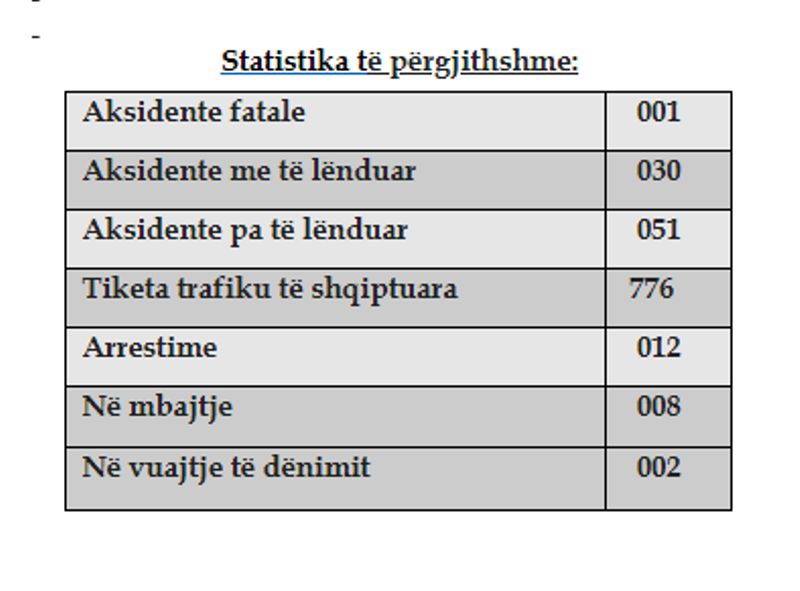 Sipas raportit policor, një aksident ka qenë me fatalitet 30 me të lënduar dhe 51 aksidente janë raportuar me dëme materiale.