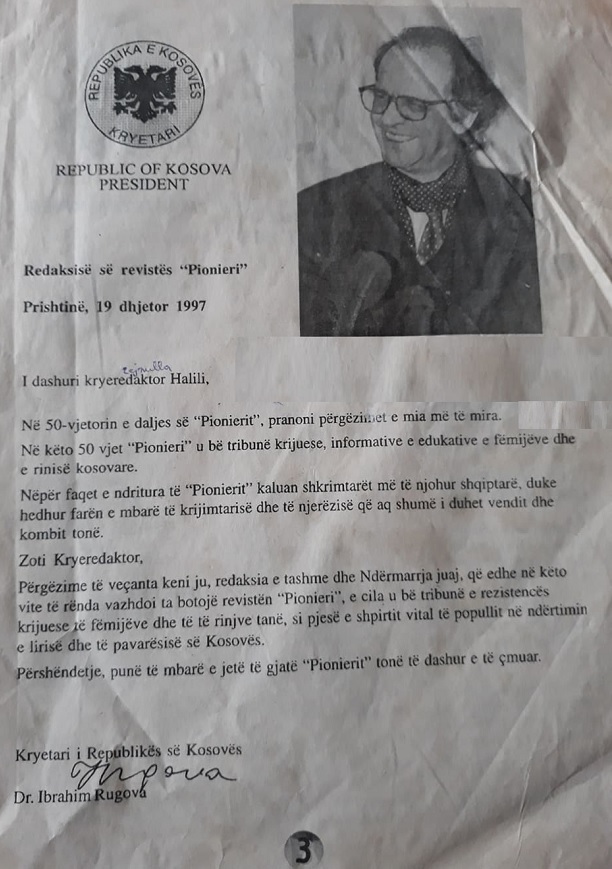 Në fotografinë e mëposhtme, shihet se presidenti Rugova ka pasur më parë vulë tjetër nga ajo që e njohim të gjithë. Në urimin e tij dërguar kryeradaktorit të revistës për fëmijë “Pionieeri”, Zejnullah Halilit, me rastin e 50 vjetorit të saj,,e që mban datën 19 dhejtor 1997, shihet një vulë ndryshe, ku shihet shqiponja e zezë brenda një hapësire të kufizuar me një rreth të zi, dhe ku shkruan “Republika e Kosovës” kurse poshtë shkruan “Kryetari”, e nën të në gjuhën angleze shkruan: “Republic of Kosova – President”.