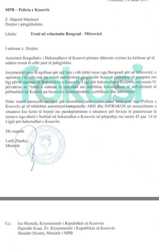 Rrena e dytë është e Hashimit, i cili u ngut që të vinte në funksion dy personazhe medietike: Beratin dhe Batonin për të përhapur dezinformatën se urdhërin për ndalimin e trenit e kishte dhënë Hashimi. “Duke vërejtur neglizhencën e autoriteteve unë sot kam ftuar ne zyrën time, duke respektuar kushtetutshmërinë dhe ligjshmërinë ne kuadër te kompetencave te mija për te ruajtur sovranitetin territorial dhe integritetin territorial, kam ftuar ministrin e brendshëm dhe drejtorin e policisë. Kam kërkuar prej tyre qe te ndalojnë hyrja e trenit në Kosovë menjëherë dhe në me çdo çmim. Kam besim te plote se autoritet do t’i kryejnë përgjegjësitë ligjore dhe kushtetuese. Institucionet duhet t’i kryejnë këto përgjegjësi. Mjaft është mjafe. Do te ketë zero tolerancë ndaj Beogradit ne cenimin e integritetit territorial te Kosovës”, ka thënë Presidenti Thaçi për gazetën Express. Kështu ka cituar KlanKosova në orën 18.03 të ditës së shtunë. Ndërkohë që thuhej se treni pritej të futej në Kosovë, rreth orës 19.30. Pra, njoftimi dhënë vetëm rreth një orë e gjysëm para se të afrohej treni në Kosovë. Dhe kjo kohë është kohë shumë më e vonë sesa koha kur treni ishte ndalur në Rashkë dhe nuk do të vazhdonte drejt Kosovës. Pra, Berati është angazhuar të citonte Hashim Thaçin se paskësh dhënë urdhër për ndalimin e trenit serb, pasi që treni veç mund të jetë ndalë në Rashkë. Në anën tjetër, një letër që fokusi.org ka siguruar dhe ka bërë publike, është letër e ministrit Zharku, i cili i është drejtuar drejtorit të Policisë së Kosovës që të ndihmohej ARH dhe INFRAKOS që të zbatojnë ligjin lidhur me trenin serb. Pra, kjo letër nuk është bërë nga ministri i Brendshëm, por nga ministri i Infrastrukturës, kurse Hashim Thaçi thotë se ka ftuar ministrin e Brendshëm dhe drejtorin e Policisë së Kosovës. Përveç kësaj, është edhe një deklaratë e zëvendësdrejtorit të Policisë së rajonit të Mitrovicës, Besim Hoti, i cili gjatë orëve të drekës ka thënë se trenin duhet t andalë policia kufitare, kurse ne do të shkojmë në ndihmë nëse na kërkohet. Dhe kjo që ka thënë Besim Hoti është në përputhje me kërkesën e ministrit Zharku në letrën dërguar drejtorit të Policisë së Kosovës. Dhe e treta, është absurde, është e pamundur që një operacion si ai për trenin të mund të planifikohet, të organizohet dhe të zbatohet brenda një ore apo dy para se të vinte treni, sepse kjo çështje nuk është veç punë e një dikasteri, as e një agjensie shtetërore, por është një çështje ndërministrore. Pra, për të planifikuar, për të organizuar e zbatuar një operacion i tillë kërkohet kohë më e gjatë se dy-tre orë. Kur t’i shtohet kësaj ndjeshmëria e çështjes, për çka do të duhej edhe një bashkërendim me aleatët tanë strategjikë dhe me bashkësinë ndërkombëtare, atëherë bëhet edhe më e pamundur që një urdhër për ndalimin e trenit të jetë dhënë në orët e pasditës, pra vetëm një orë, dy apo tri para se të vinte treni.