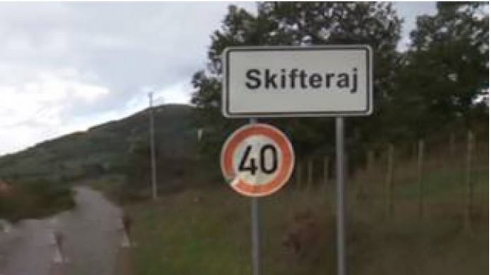 Në tabelë lajmërohet hyrja për në fshatin Skifteraj. Edhe një tabelë tjetër tregon drejtimin tek vendbanimi i njëjtë por me emër tjetër.