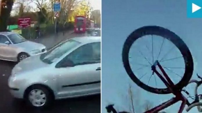 Videoja tregon çiklistin duke ecur me shpejtësi në korsinë e biçikletave në Londër, kur një veturë kthehet në kryqëzim duke i dalë atij para dhe duke e hedhur në ajër.