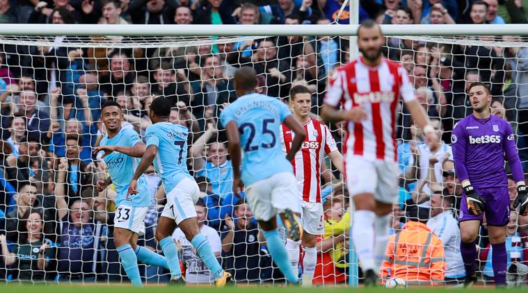 Soccer Football - Premier League - Manchester City vs Stoke City - Etihad Stadium, Manchester, Britain - October 14, 2017 Manchester City's Gabriel Jesus celebrates scoring their first goal with Raheem Sterling Action Images via Reuters/Jason Cairnduff EDITORIAL USE ONLY. No use with unauthorized audio, video, data, fixture lists, club/league logos or "live" services. Online in-match use limited to 75 images, no video emulation. No use in betting, games or single club/league/player publications. Please contact your account representative for further details.