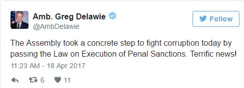 “Me kalimin e ligjit mbi Ekzekutimin e Sanksioneve Penale, Kuvendi mori hap konkret në luftimin e korrupsionit…”,shkruan Delawie, në Twitter.