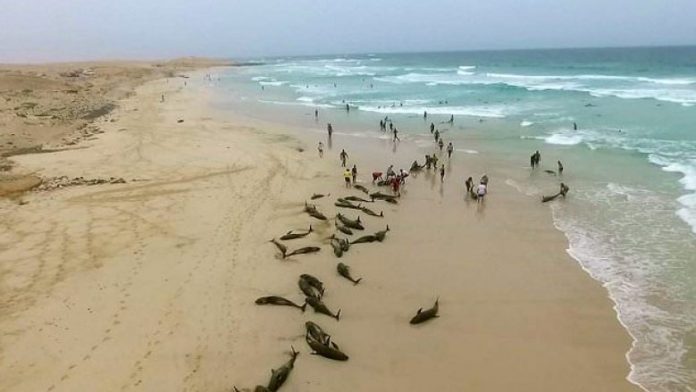 Më se 100 delfinë ngecën në ujërat e cekëta të një bregdeti në Afrikën Perëndimore, pasi u afruan vet në mënyrë shumë misterioze.