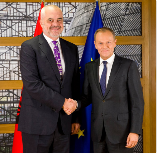 Kryeministri Edi Rama është takuar në Bruksel me kreun e Këshillit të Europës, Donald Tusk. Ka qenë vetë kreu i KiE i cili përmes një postimi në Twitter të shoqëruar edhe me një foto shprehet se kishte zhvilluar një takim të mirë me kryeministrin shqiptar, ndërsa thekson se vendi duhet të vijojë me reformat për shtetin ligjor duhet të vijojnë për të avancuar rrugën drejt BE.