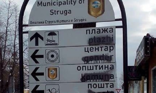 LajmeVendiGjuha shqipe fshihet në tabelat e Strugës 13.01.2017 16:25:32Kemi vërejtur që në tabelat në Strugë është pastruar përkthimi në gjuhën shqipe. Ju mund ta vëreni këtë edhe në fotografinë e vendosur më poshtë, ku vërehet se përkthimit në shqip i kishin rënë me ngjyrë të zezë./fokusi.org/