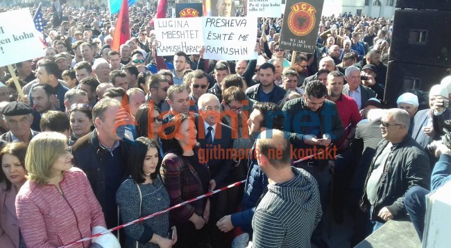 Në protestë po marrin pjesë zyrtarët e Aleancës për Ardhmërinë e Kosovës, Vetëvendosjes dhe Nismës, raporton lajmi.net