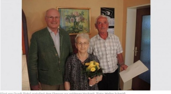 Gjatë ditëve të kaluara, ata e patën përvjetorin e tyre të artë, të cilin e festuan në shtëpi me fqinjët dhe me familjarët e shumtë, jo vetëm njëherë, ka pohuar çifti i artë, në momentin që Alexander Fürst nga Quadt, si përfaqësues i kryebashkiakut i uroi përvjetorin në emër të qytetit me një buqetë lulesh dhe ia ndau mirënjohjen e kryeministrit.
