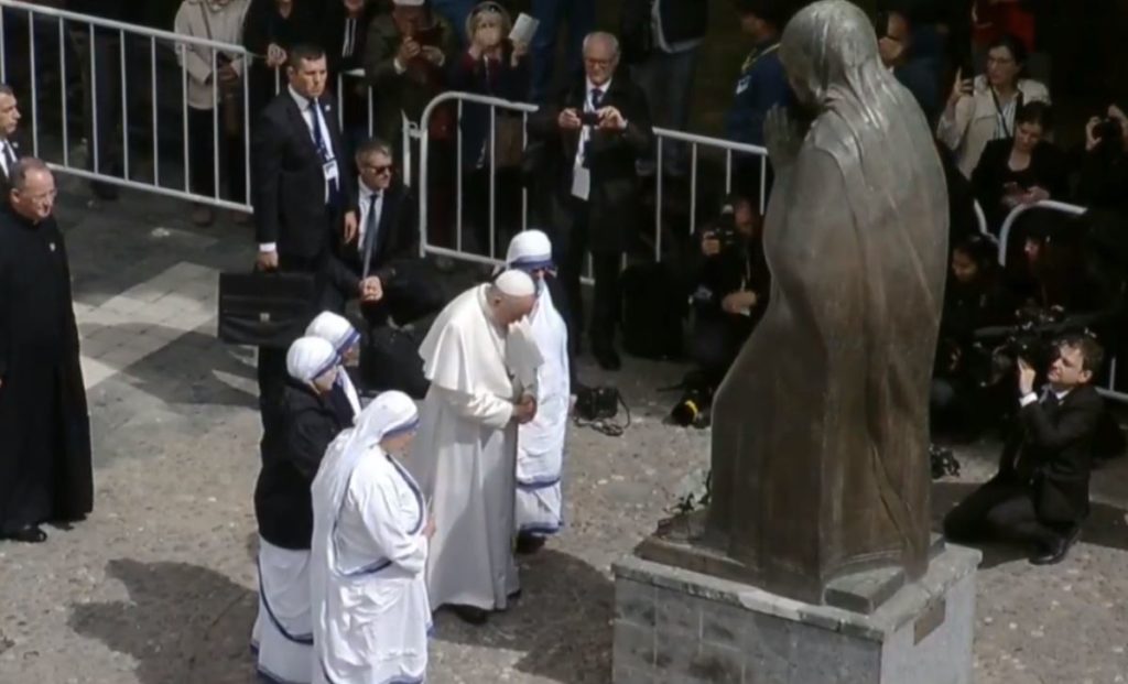 Pas vizitës me kreun shtetëror në Vilën Vodno, në kuadër të viiztës në Maqedoni Papa Françesku ka vazhduar vizitën e tij në Shtëpinë Muze të Nënës Terezë, ku është përkulur para përmendores së Shën Terezës në Sheshin Maqedonia.