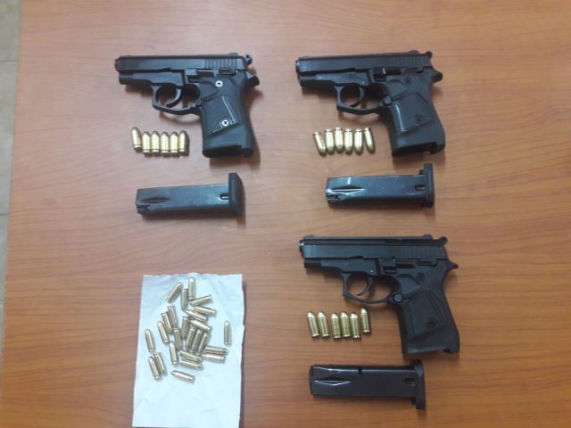 Gjatë kontrollit fizik, poshtë xhupit ju gjetën dhe sekuestruan në cilësinë e provës materiale, 3 armë zjarri Pistoletë, tip “Glock”, 25 fishekë.