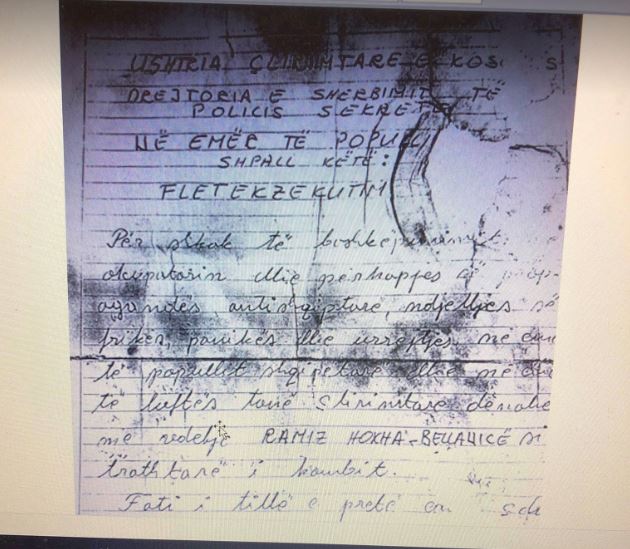 “Ushtria Çlirimtare e Kosovës, Drejtoria e Shërbimit të Policisë Sekrete, në emër të popullit shpall këtë fletëekzekutim: për shkak të bashkëpunimit me okupatorin, ndjelljes së frikës, panikës dhe urrejtjes, në emër të popullit shqiptar dhe në emër të luftës tonë çlirimtare dënohet me vdekje Ramiz Hoxha – Bellanicë si tradhtar i kombit. Fati i tillë do t’a pret çdo tradhtar tjetër”, shkruan në fletë ekzekutimin që i ishte lënë, në kufomën e Ramiz Hoxhës, më 2 tetor 1998.