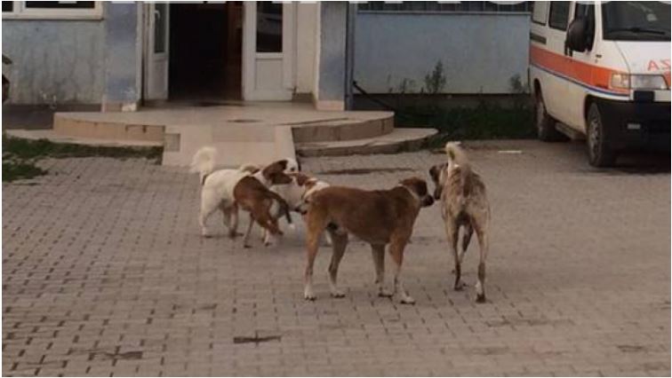 Është Qendra Kryesore e Mjekësisë Familjare “Nënë Tereza” në Klinë, para së cilës shihet një grumbull qenësh endacakë, njofton Klan Kosova.