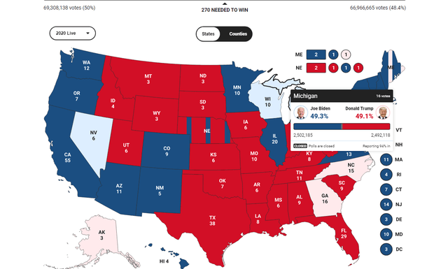 Sipas votave rezulton se 2,502,185 ka Biden, ndërsa Trump 2,492,118 vota. Diferenca është e ngushtë me 10,067 vota dhe se janë numëruar 94% e votave të këtij shteti që ka 16 vota zgjedhore.