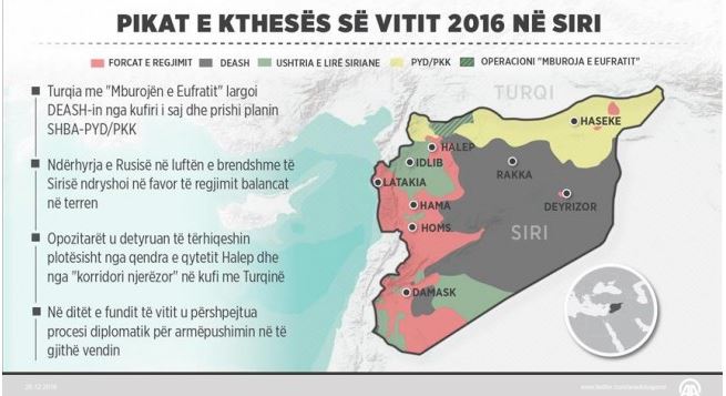 Zhvillimi më i rëndësishëm i vitit 2016 në luftën e brendshme të Sirisë e cila ka hyrë në vitin e saj të gjashtë ka qenë fillimi i Operacionit “Mburoja e Eufratit” nga Turqia kundër organizatave terroriste, raporton Anadolu Agency (AA).
