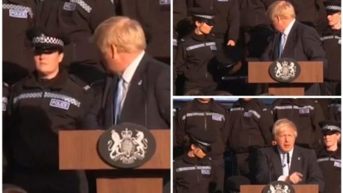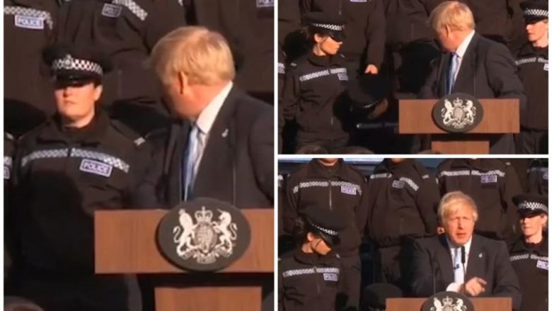 Pjesëtarët e policisë angleze që po qëndronin në këmbë të rreshtuar prapa foltores nga e cila kryeministri britanik i drejtohet qytetarëve, kur në një moment një police filloi të ndihet keq sa që këtë e vërejti edhe vetë Johnson.