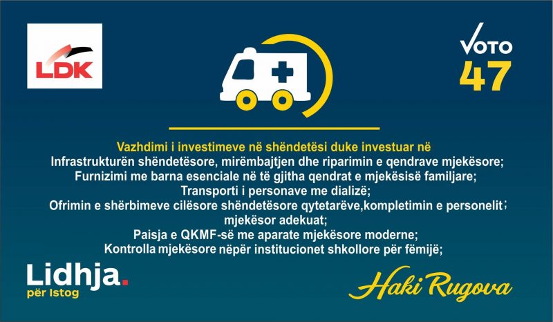 Në katër vitet e ardhshme të qeverisjes Rugova premton investime në infrastrukturën shëndetësore, mirëmbajtjen dhe riparimin e qendrave mjeksore, furnizimi me barëra esenciale në të gjitha qendrat e mjeksisë familjare, transporti i personave me dializë, ofrimin e shërbimeve shëndetësore cilësore për qytetarët, kompletimin e personelit cilësorë adekuat, paisja e QKMF-së me aparate mjeksore moderne, si dhe kontrolla mjekësore në institucionet shkollore për fëmijë./fokusi.org/