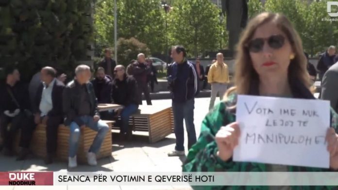 Flutra Zymi është njëra nga protestuesit, e cila mbanë në dorë një pankartë me mbishkrimin “Vota ime nuk lejojë të manipulohet”.