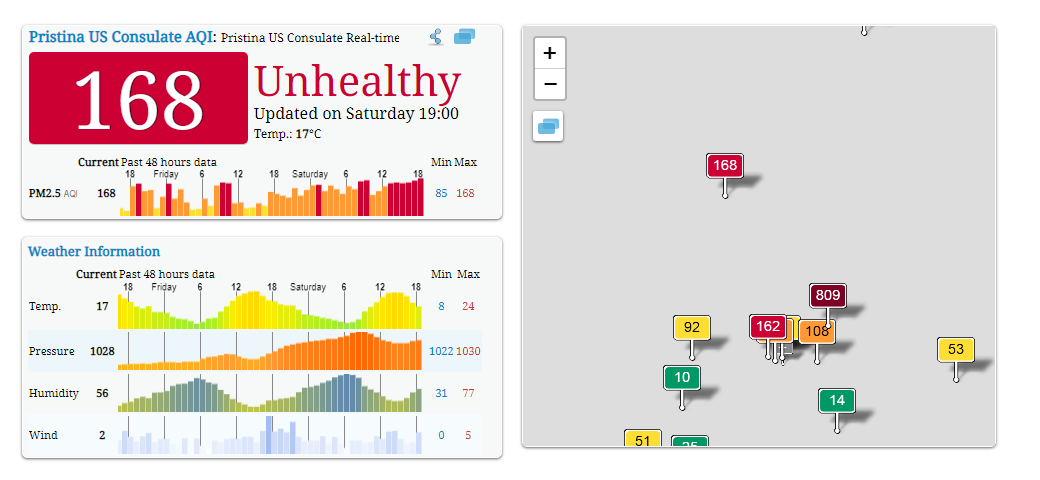 Sipas matësit të vendosur nga ambasada amerikane në Prishtinë, niveli aktual ndotës në kryeqytet është 168 ppm.