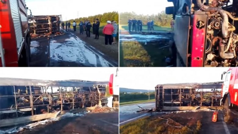 Autoritetet thanë se autobusi ishte përmbysur dhe e kishte përfshirë flaka, pas ndeshjes me kamion.