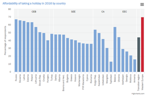 Në anën tjetër, gjenden vendet me përqindje të ulët që janë Armenia, Azerbajxhani, Gjeorgjia dhe Taxhikistani, ku më pak se 20% e të anketuarve raportojnë se mund të përballojnë pushime jashtë shtëpisë.