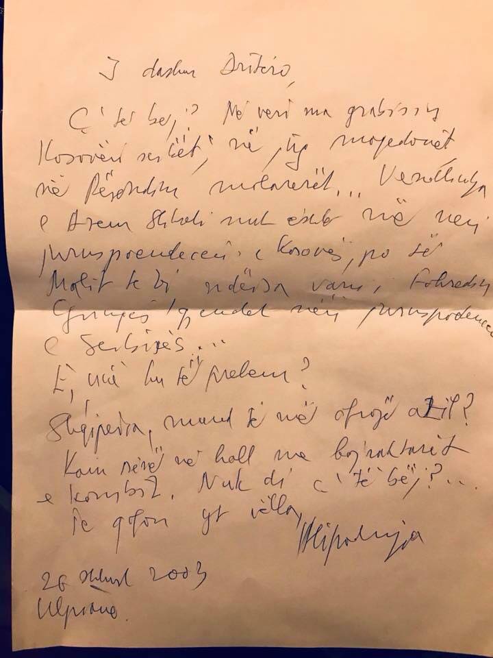 —- I dashur Dritëro , Ç’të bëj? Në veri ma grabisin Kosovën sërbët , në jug maqedonët, në Perêndim malazezët…Vendlindja e Azem Shkrelit nuk është më nën jurisprudencën e Kosovës, po të Malit të Zi , ndërsa varri i Fahredin Gungës gjendet nën jurisprudencën e Serbisë …