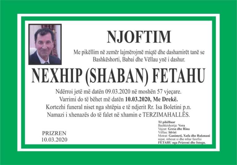 LajmeVendiVdes një pjesëtar i Policisë së Kosovës 10.03.2020 01:11:03a ndërruar jetë në moshën 57 vjeçare pjesëtari i Policisë së Kosovës në Prizren, Nexhip Fetahu.Fetahu ka qenë pjesëtar i Policisë së Kosovës, në Pikën Kufitare të Vërmicës.Varrimi i të ndjerit bëhet nesër më datë 10.03.2020
