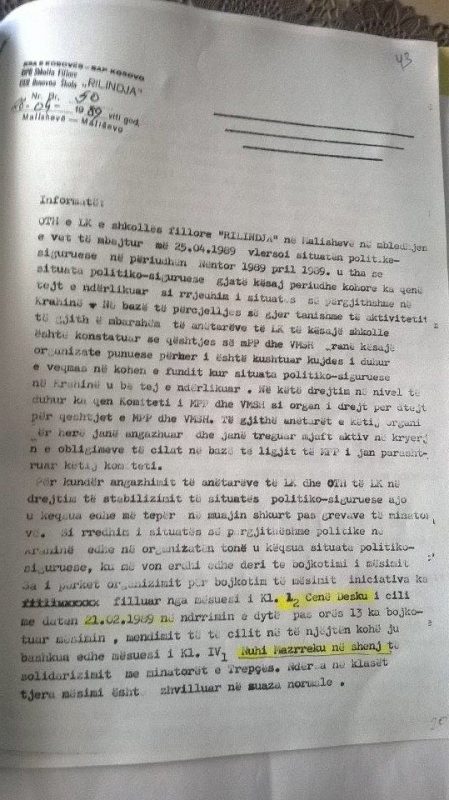 Veprim absurd i ish-drejtorit dhe Komisioneve të Shkollës fillore ish-“Rilindja” në Malishevë, te vitit 1989!